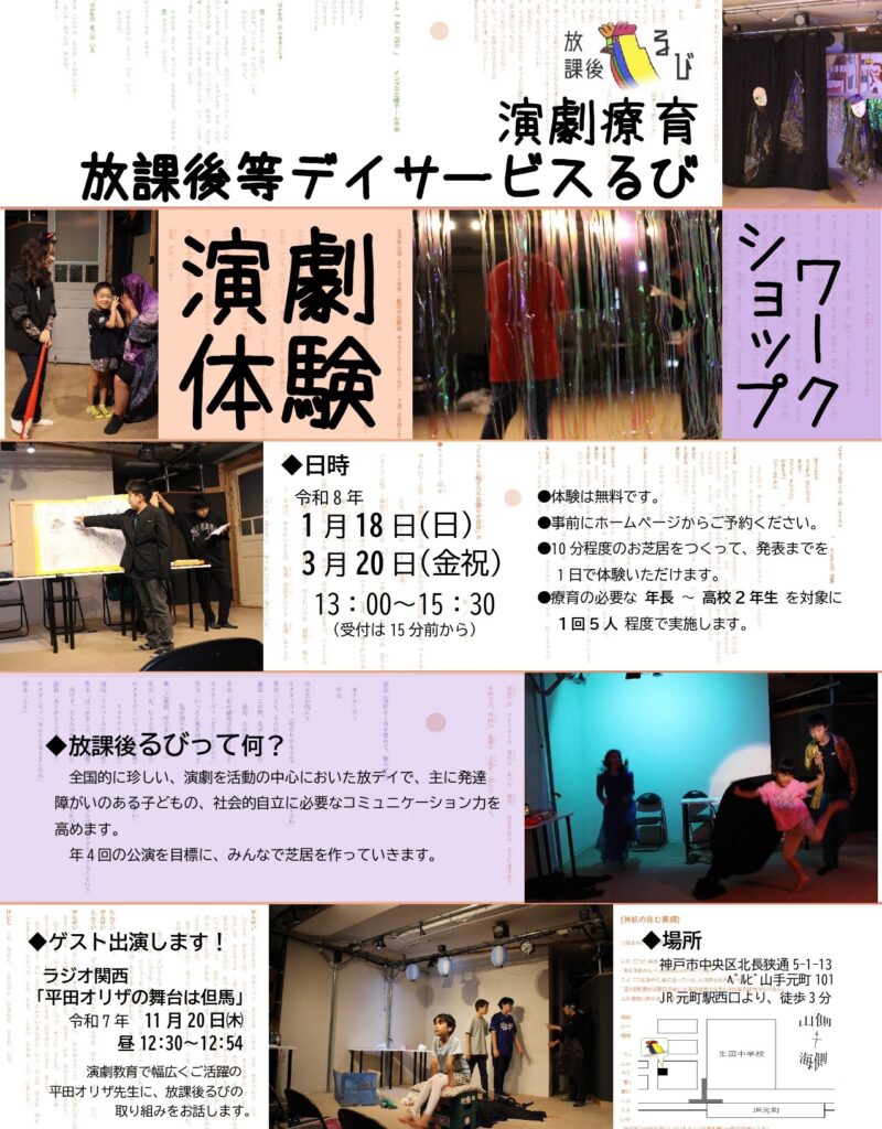 神戸市中央区・元町駅徒歩2分の場所にある放課後等デイサービス「放課後るび」は、自閉症、発達障がい、ADHD、グレーゾーン、二次障害などでコミュニケーションに不安を感じるお子さまを対象に、全国でも珍しい「演劇療育」を提供しています。